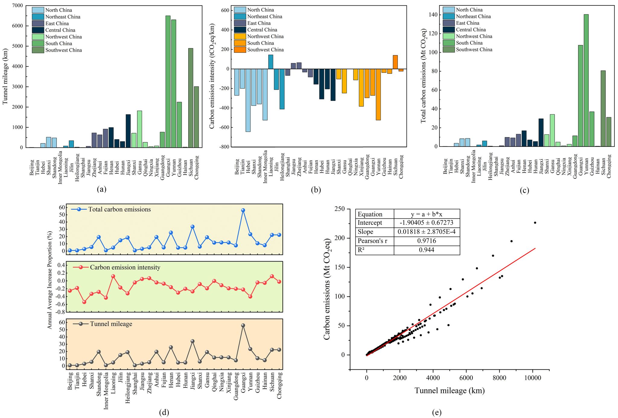 Fig. 5: Analysis of highway tunnel mileage, carbon emission intensity, and total emissions growth for each province in China from 2023 to 2030. a Highway tunnel mileage. b Highway tunnel carbon emission intensity. c Highway tunnel total carbon emissions. d Annual average growth rates of highway tunnel mileage, carbon emission intensity, and total emissions. e Correlation analysis of tunnel mileage and carbon emissions.