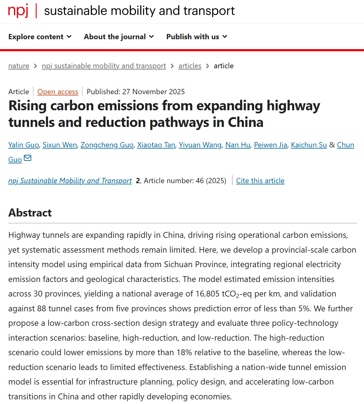 近日,bat365中文官方网站地下工程绿色低碳前沿创新团队在Nature合作子刊《npj Sustainable Mobility and Transport》上发表了题为 “Rising carbon emissions from expanding highway tunnels and reduction pathways in China”的研究论文。