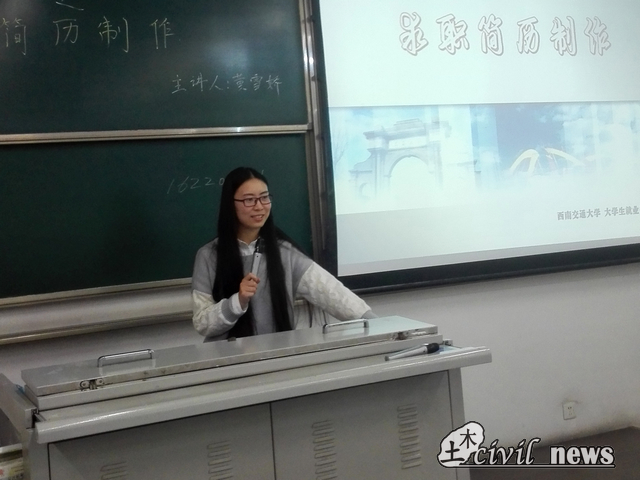 为进一步提升土木工程学院大三年级准毕业生求职技能水平及毕业生就业竞争力,根据学校“继续实施2015年度《大学生求职技能提升》的通知”以及具体的安排要求,土木学院针对大三学生开展行业及就业技能提升培训,以期帮助同学们解决对于未来的就业即将面临的各种问题与困惑。2015年3月31日19点30,由黄雪娇老师对土木2012级同学讲授了第一节课——《简历制作》。