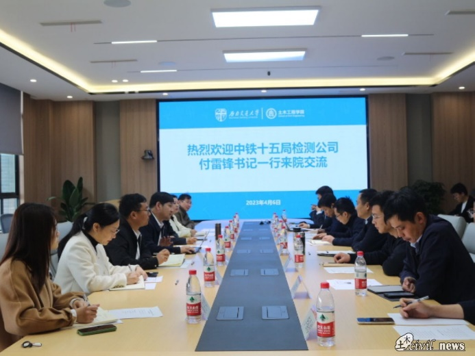 4月6日上午,中铁十五局检测公司党委书记付雷锋,党委副书记张长春,副总经理李育海,综合部经理周丽民,工程试验部经理周军艳,混凝土专家朱建立,工程测量部部员蒋子琴一行人来院进行科研、就业情况交流,土木工程学院党委书记高平平,党委副书记周曦,副院长陈嵘,地下工程系副系主任郑余朝,桥梁工程系教授徐腾飞,实验教学示范中心副主任张迅、李福海及本科生就业工作专项负责人李裕老师参与此次交流座谈。会议由陈嵘副院长主持。