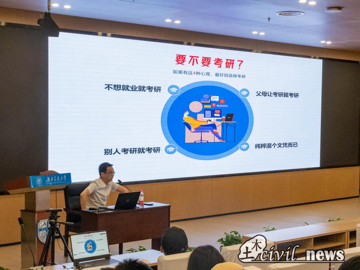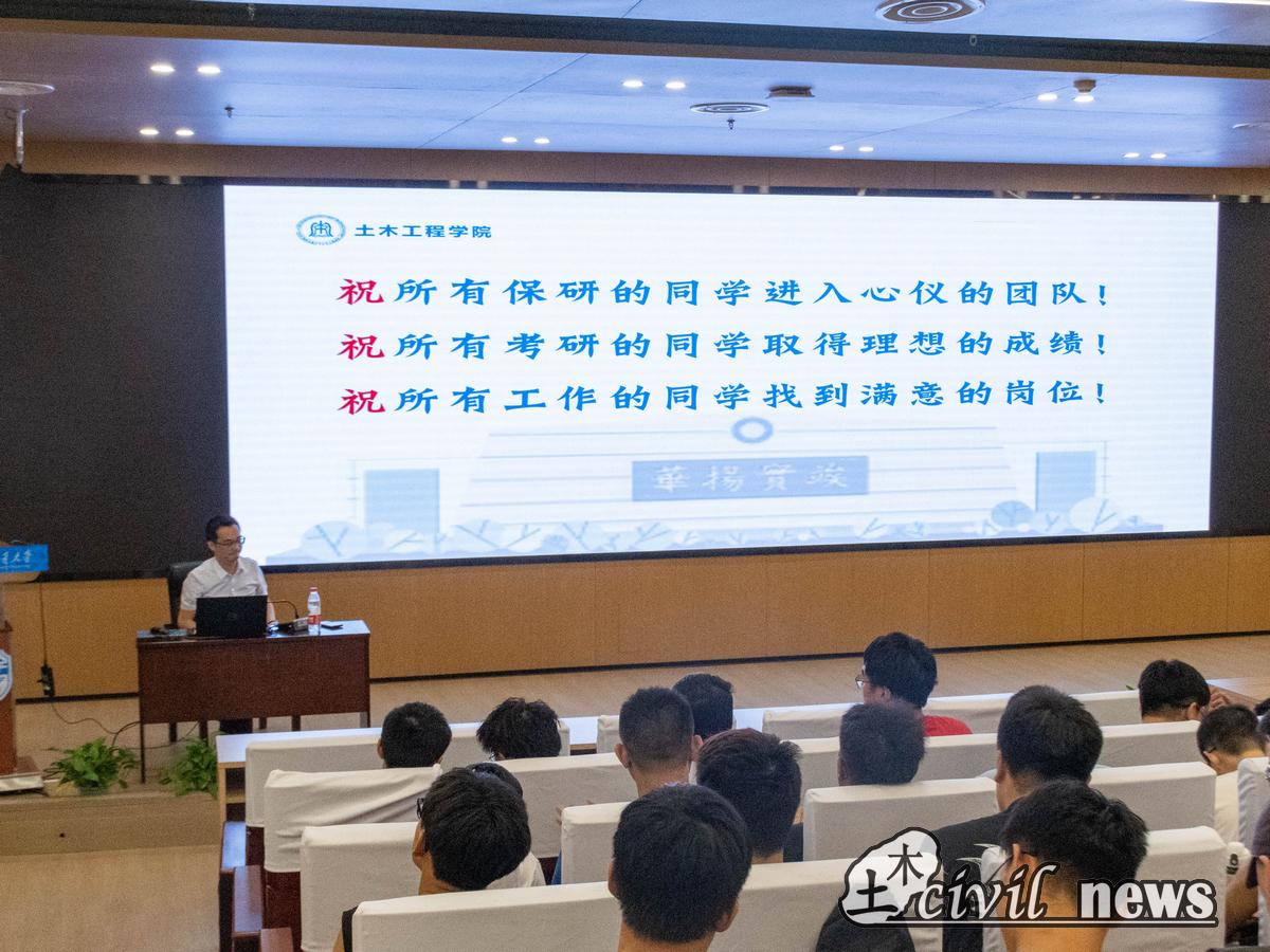 就业是最基本的民生,就业稳则民心稳、社会稳。学校、学院高度重视就业工作,深切关怀学院毕业生即将面临的青年就业问题。围绕促进学院应届生就业选择问题,土木工程学院党委副书记周曦详细阐述了应届生毕业将面临哪些具体选择,介绍了就业、保研、考研等方面的详细调研数据。他指出,不论学生选择就业创业还是选择升学深造,学校和学院始终会为学生提供支撑、保驾护航。同时他指出,学生做出未来人生规划的选择之后就要坚定不移地为之努力。此外,周曦副书记还介绍了考研方面相关注意事项。