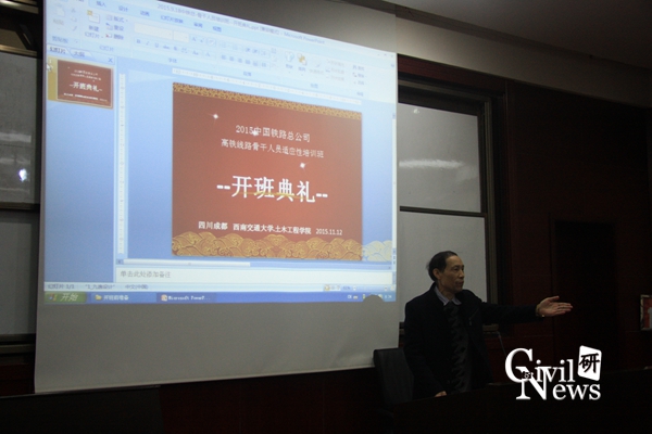 11月18日上午8:30,2015年中国铁路总公司“高铁线路骨干人员适应性培训班”开班典礼在西南交通大学九里校区0224教室隆重举行。土木工程学院任宝良副院长、土木工程学院继续教育中心江富长书记以及各个铁路局学员出席了此次开班典礼。此次培训班的学员主要由来自各铁路局及铁路集团的领导和高铁线路骨干人员组成,培训的目的是针对当前高铁工程一线生产作业状态,与学员一起学习研讨相应实际问题,提高学员的适应性能力,为以后的高铁生产作业提供理论和技术的双向支持。