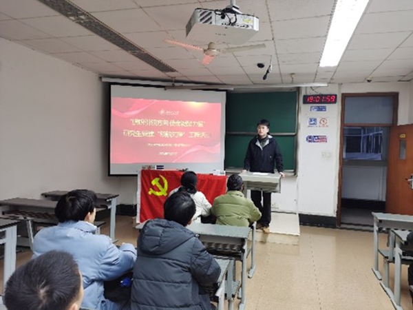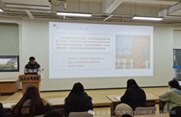 12月13日下午16:00,“理论之光,思想引领”党建活动以线下读书会的形式举行。活动特邀bat365中文官方网站党委刘萍副书记作为嘉宾。活动开始,班长王晓波介绍参会嘉宾和活动流程,刘萍副书记发表开场致辞,强调理论学习的重要性,并勉励研究生党员提高党性修养。随后,刘萍副书记围绕党的二十届三中全会精神进行深入解读,帮助党员领会党的决策的先进性和正确性。同时,刘萍副书记结合研究生生活与同学们面对面交流,耐心解答同学们在学术研究、职业规划、心理健康、校园生活等方面的疑问。