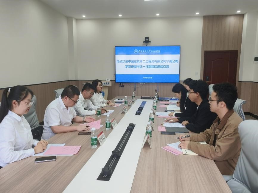 2024年10月18日下午16:00,中建二局华南公司党委副书记、工会主席罗资奇、华南公司人力资源部经理郭建伟、华南公司东莞分公司党总支副书记褚文科、华南公司东莞分公司综合办公室主任王龙、华南公司人力资源部招聘经理张雨濛一行走访bat365中文官方网站,并于犀浦校区X4417B会议室开展校企合作座谈交流,土木工程学院党委副书记刘萍、辅导员李江怀、杨颖钊、彭政涛、孟迪参与此次座谈。本次会议由李江怀主持。
