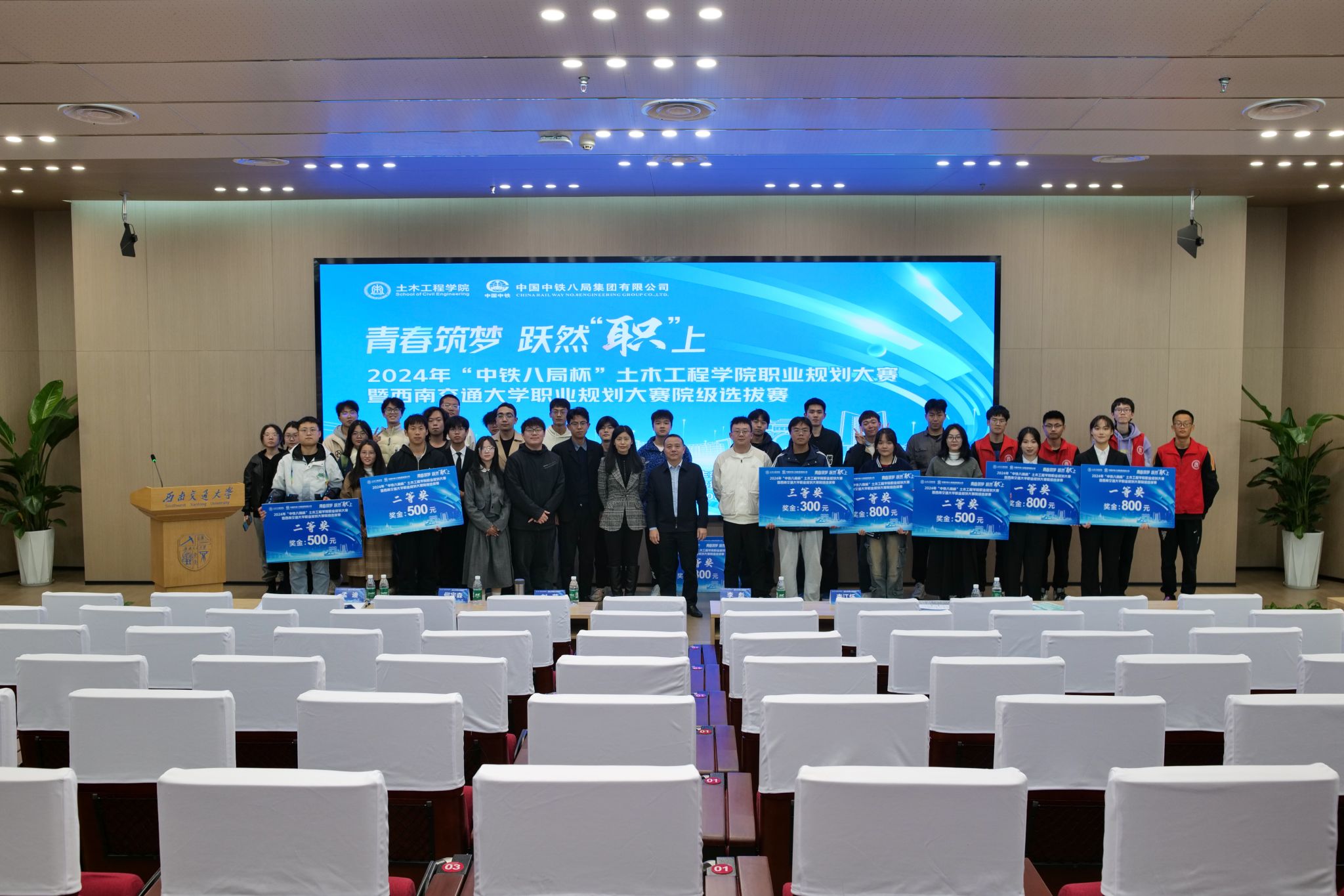 “青春筑梦,跃然“职”上”——2024年11月23日14点,2024年“中铁八局杯”土木工程学院职业规划大赛在西南交通大学犀浦校区图书馆二号报告厅顺利举行。本次大赛作为学校职业规划大赛院内选拔赛,旨在引导大学生树立正确的成才观、就业观和择业观,科学合理规划学业与职业发展,提升就业竞争力。中铁八局城市轨道交通分公司副总经理李彪、土木工程学院党委副书记刘萍、中铁八局人力资源部何宇森及辅导员出席并担任本次大赛评委,比赛共吸引了200余名学生到场观摩。