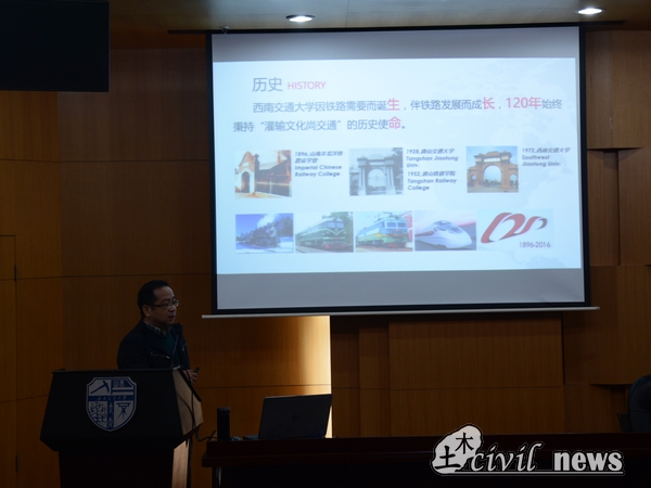 刘剑锋副处长对树德师生的到来表示欢迎,并以生动的描述介绍了百年交大的发展历史和发展现状,并欢迎树德学子报考交大。树德中学杨绍乾老师以自己的切身实例讲述了对梦想对事业的追求,希望同学们能提前了解大学生活和学习,为自己的梦想做好规划。土木工程学生代表与树德中学学生代表均上台发言分享自己对大学的感悟。最后,土木学院桥梁系何畏副教授为大家做了土木工程认知介绍。何教授以诙谐生动的语言从“交大之大”“土木不土”“桥梁很酷”“高铁很火”和“城市更绿”五个方面同学们讲述了交大的历史、高科技在土木工程领域的应用以及土木工程的发展前景。