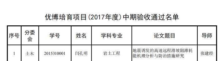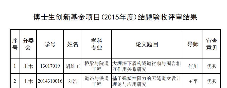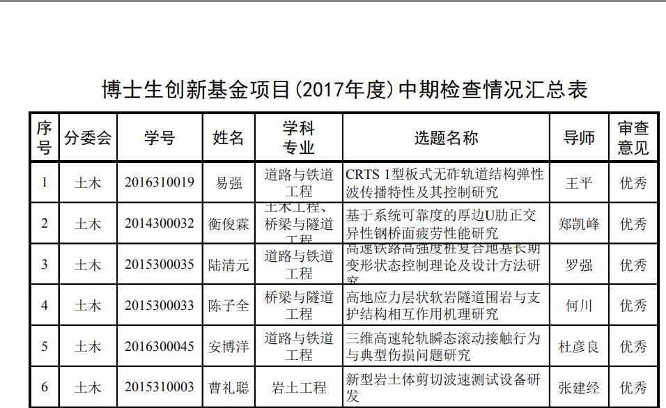 接到研究生院通知:根据《西南交通大学博士研究生创新基金项目管理办法(修订)》(西交校研[2017]27号)和《西南交通大学优秀博士学位论文培育项目管理办法(修订)》(西交校研[2017]26号)精神,经个人申报、分委会初评推荐、专家评审通过,现公示土木工程学院博士生创新基金项目(2015年度)结题验收评审结果、博士生创新基金项目(2017年度)中期检查评审结果、优博培育项目(2017年度)中期验收通过名单。
