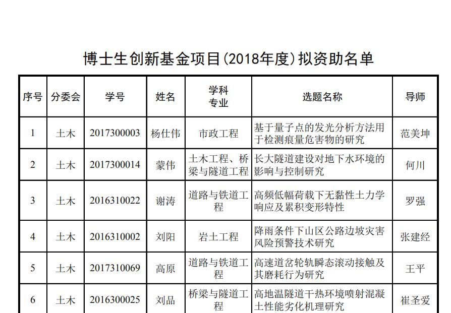 西南交通大学2018年博士创新基金项目拟资助人员名单公示