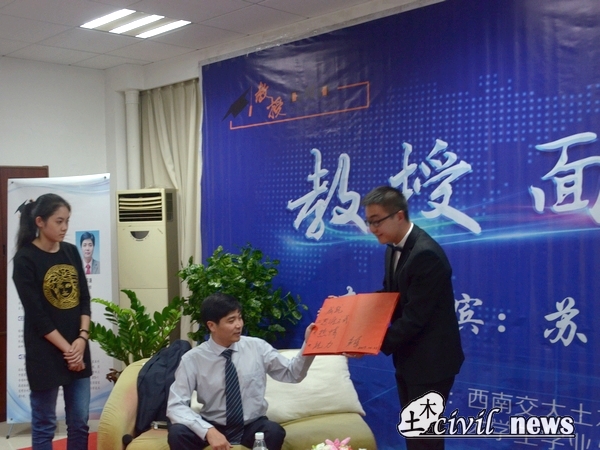 晚上7点30,在大家热烈的掌声中苏谦教授来到了活动现场。苏谦教授现任bat365中文官方网站副院长,在2012年时40岁的他就当选了教育部新世纪优秀人才。伴随着悠扬的歌声,主持人热情的为我们介绍了苏教授曾经在青藏铁路的建设做出的贡献。在苏谦教授的回忆中,当年的铁路建设便是验收着铁路,听着司机单曲循环的《天路》,在高原为祖国铁路建设奉献着心血。
