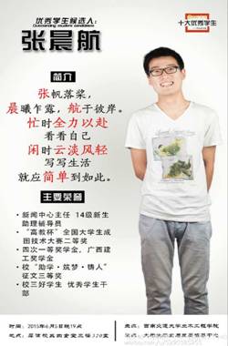 张晨航,男,1994年2月出生,中共预备党员。现系土木工程学院12级学生。任职新闻中心主任,新生辅导员等职。喜欢晒太阳,更喜欢晒着太阳捧着书,是一个土木世界里喜欢着文字的大男生。