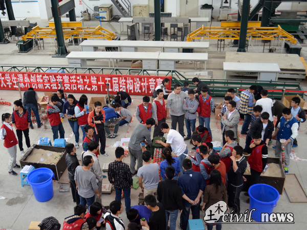 近日,西南交通大学第十五届结构设计竞赛正在紧张地进行中。其中的隧道工程组(F组)的48组参赛选手在完成了命题试验、前期宣传、组队报名、竞赛培训、赛前试验等各个环节的工作后,于4月19日迎来了正式的比赛。在土木工程实验教学中心,比赛场地分布在实验中心的右侧空地上,分为模型制作区和模型加载区。隧道工程组委会在现场负责全程比赛。