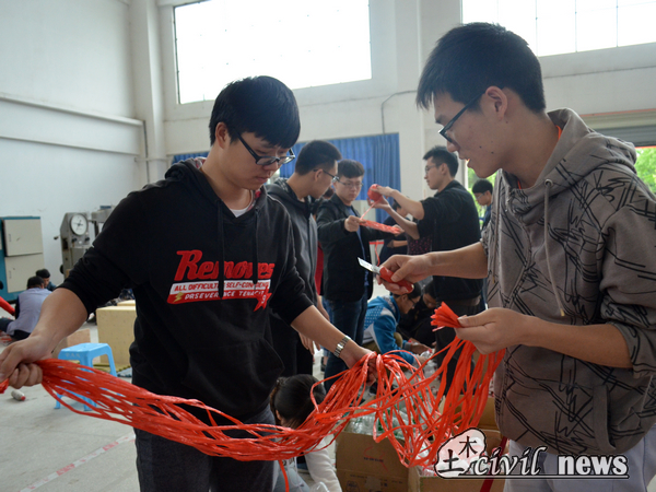 8点整,选手们开始动手。多组同学在制作时分工很是明确,有的负责确定模型的线性;有的依据设计方案捆扎瓶子;还有的往瓶子里填充沙子以稳固模型。纵观全场,选手们的模型制作大概分为两大方式,一种是对塑料瓶进行加工处理,嵌套在一起,弯成拱形;另一种是保持塑料瓶完整的结构,通过捆绑形成拱形。而在加沙和加水的处理上各个组的选手也都有着自己的不同理解。加水或沙,模型质量过重;不加,又唯恐承重不达标。整个模型制作现场充斥着大家激烈的讨论声。而在一旁观看赛程的评委老师则仔细地观察着选手们的模型制作,时而探头仔细听着大家的讨论制作步骤,时而仔细观察新颖的造型并进行拍照。