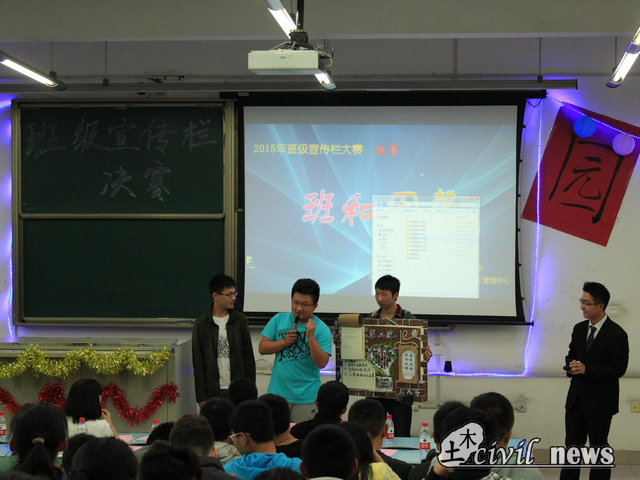 4月12日晚,由土木工程学院团委主办、土木园区管理中心承办的2015“班和园馨”班级宣传栏大赛决赛在X2319举行。本次比赛共有八个班级进入决赛,共产生一等奖一名,二等奖三名,三等奖两名。