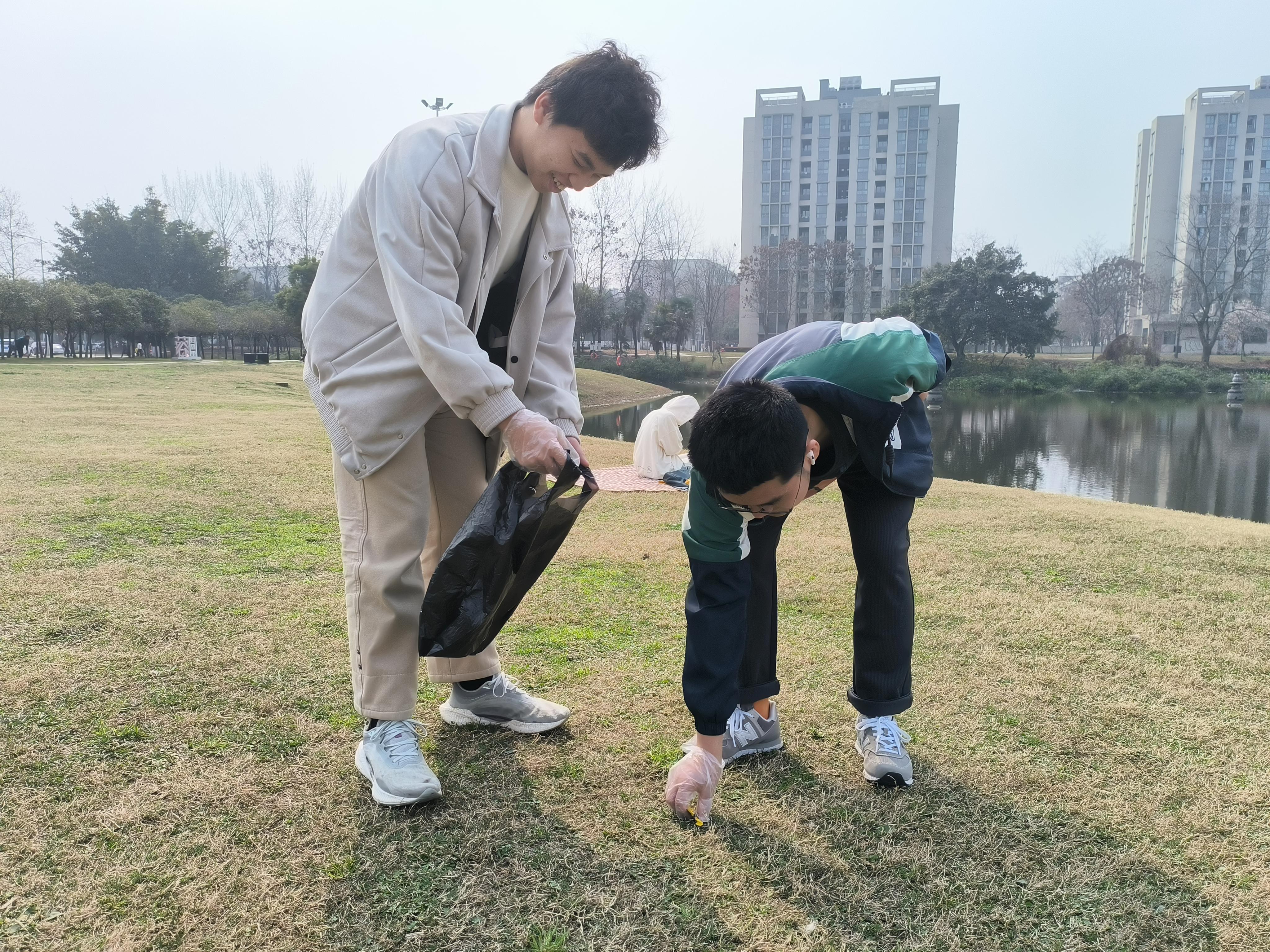 在欣赏美景的同时,志愿者们也发挥不怕脏、不怕累的精神,手持铲子、火钳、垃圾袋等工具,认真用心地清扫犀湖周边垃圾,捡拾漂浮在湖面的垃圾、杂草、枯烂树枝等漂浮物,使湖面更加清澈。在削减垃圾的同时,更需要控制垃圾的产生,因此,志愿者们也劝导周围的同学们,观景需文明,在欣赏美丽风景与可爱校宠的同时,也要注意保护生态安全。