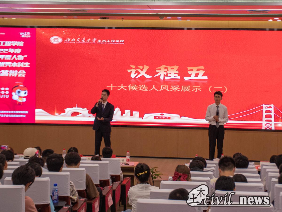 为总结经验,树立典型,发挥优秀学生的引领、示范作用,着力培养具有“红心”“红志”“红业”“红行”的“四红”土木人,2023年5月26日晚19:00,由土木工程学院学业与发展指导中心举行的2022红土年度人物暨十大优秀本科生评选答辩会于图书馆1号报告厅举行。出席本次评选会的嘉宾有:土木工程学院党委副书记周曦、学院团委书记刘萍、团委副书记石莹、学院实验教学中心的副主任张迅、土木2020-05班班导师曾艳华、土木2020-03班班导师郭春、土木2020-08班班导师李琼林、地下2020-03班班导师严健、土木(茅班)2020-01班班导师魏江涛、土木2020-19班班导师卫星以及学院辅导员老师们。