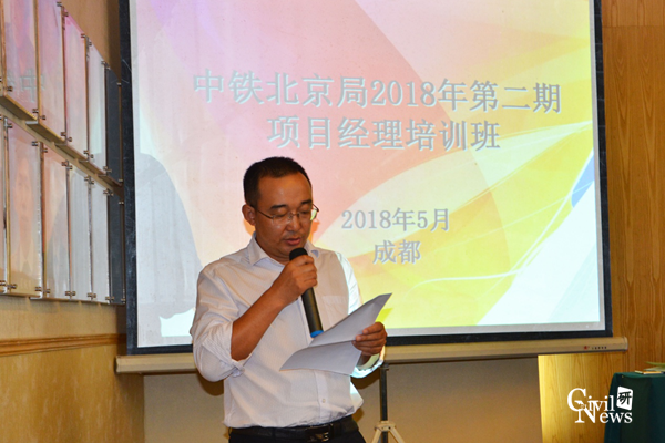 随后,中铁北京工程局集团有限公司副总经理耿午阳发表了重要讲话。耿午阳总经理用一组组鲜活的数据回顾了企业过去几年取得的辉煌成就,同时指出了企业现阶段发展所面临的一些问题,并就举办项目经理培训班的目的和意义进行了深刻剖析,最后,对学员培训期间和培训后的学习、工作和生活提出了四点要求:一要提高认识,端正学习态度;二要要严肃纪律,确保学习培训取得实实在在的效果;三要力求实效,达到学有所获;四要积极取证,做到合规履职。