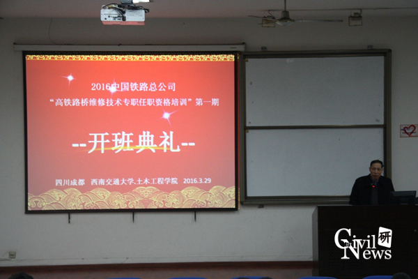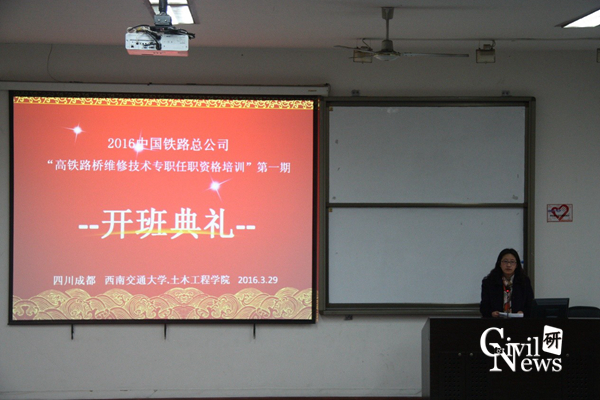 3月29日,中国铁路总公司“高铁路桥维修技术专职任职资格培训班”第一期开班典礼在九里校区信息楼0231会议室隆重举行。早上8:30,西南交通大学土木学院党委副书记李彤梅、继续教育中心书记江富长准时来到典礼现场,共同见证这个激动人心的时刻,开班典礼由土木工程学院继续教育中心江富长书记主持。