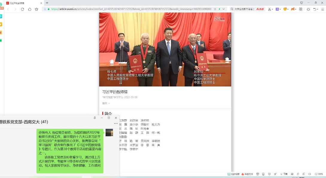 今日(教师节前夕),在学院党委的组织下,我支部全体党员在线观看了教育部会同“学习强国”联合制作推出的《习近平的教师情》专题片。专题片通过记录的方式回顾了十年来习近平总书记对教育事业的重视,对人民教师的尊重,从大学、职业院校到中小学,他走遍了全国各地,深入到教师和学生中间,关心教师、关心学生、关心教育。走访大学、和师生亲切地握手、给老院士颁发荣誉证书、给广大师生的回信中处处都展现了习近平总书记对教育的重视,对人民教师神圣职业的尊重。