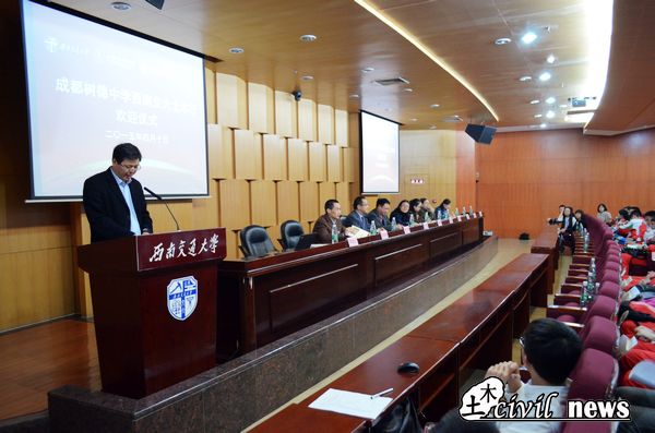 4月10日,成都树德中学各位师生来到西南交通大学进行参观,土木学院的师生为其在图书馆二号报告厅举行了隆重的欢迎仪式。本次活动主要通过科普讲座、实验室参观、简单结构模型制作等参观交流来增进同学们对西南交大土木工程专业的初步认知,培养他们对土木工程学科的兴趣,为其将来的成长成才提供一条宽广的道路。在欢迎仪式上,《交大蓝》的宣传片吸引了树德学子的目光,土木学院党委李锦红副书记在之后发表讲话,表示土木学院对树德中学一行来交大参观的欢迎,并简单地介绍了交大的概况。树德中学的文波主任也表示他们相当重视此次的访问,同时非常感谢西南交大对此次访问的大力支持和诚挚欢迎,希望交大的老师们能对活动中学生们的不足加以指正。