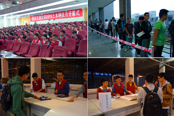 为实现立体化的实践教学培养模式,加强土木科技月系列活动对学生的实际指导与提升作用,使各个不同层次的学生都能获得创新实践动手能力的提升,土木学院大力推进“土木科技月”系列活动的开展。经过多次筹备会议的召开以及各项赛题的制定和完善,2015土木科技月于3月30日在犀浦校区一号报告厅正式开幕。4月2日,大学生科创中心组织实施了第十五届结构设计大赛的报名工作,并于4月14日发放了各赛题材料。2015土木科技月共有390人报名桥梁工程组,333人报名建筑工程组,150人报名铁道工程组,210人报名岩土工程组,192人报名隧道工程组,138人报名道路工程组,78人报名图学竞赛。