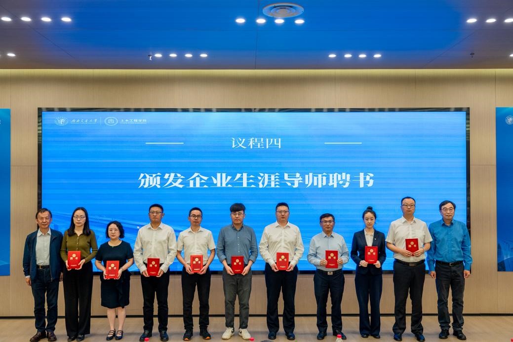 随后,土木工程学院院长蒲黔辉宣读了《土木工程学院企业生涯导师聘任决定》,聘任包括中铁一局集团有限公司张伟在内的70名企业人士为土木工程学院本科2020级企业生涯导师;聘任包括中铁大桥局集团有限公司吕静在内的67名企业人士为土木工程学院本科2021级企业生涯导师;聘任包括中建科工集团有限公司魏梦潇在内的56名企业人士为土木工程学院本科2022级企业生涯导师。之后,由学校招生就业处处长陈岩峰、土木工程学院院长蒲黔辉为企业生涯导师代表颁发聘书。
