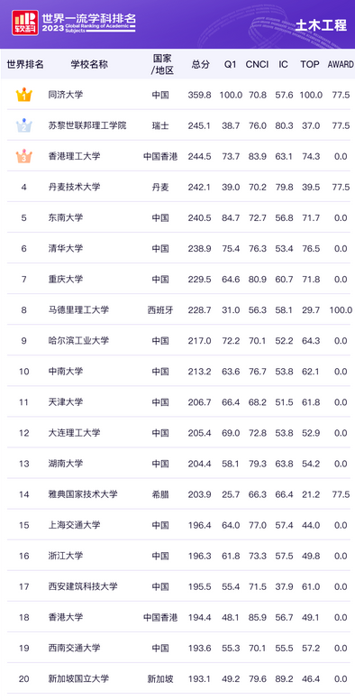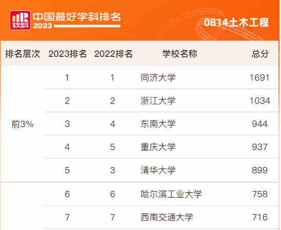 土木工程学科在2023软科“世界一流学科排名” 位列第19名