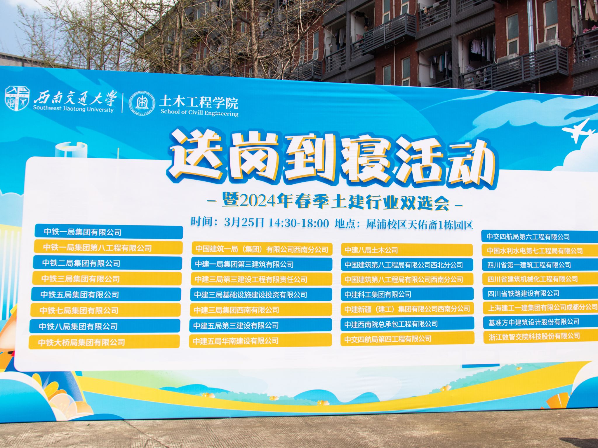 为深入贯彻落实党的二十大精神,落实党中央、国务院“稳就业”“保就业”决策部署,促进毕业生更高质量更加充分就业,土木工程学院于2024年3月25日下午在犀浦校区天佑斋1栋学生宿舍园区成功举办了一场别开生面的“送岗到寝”活动暨2024年春季土建行业双选会。
