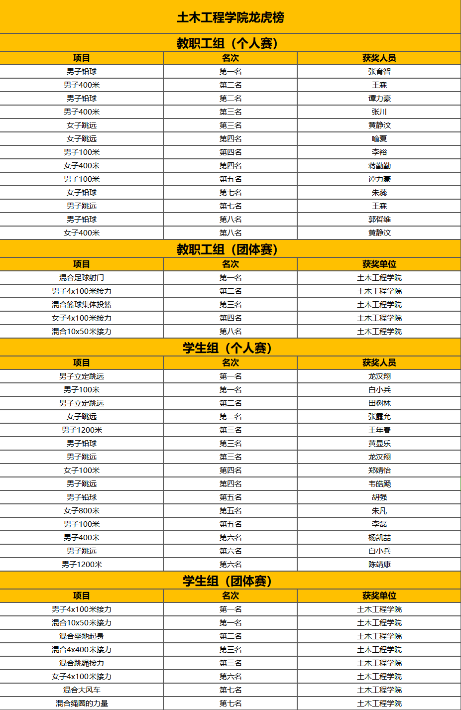 本次校运会上,土木师生奋勇争先、团结协作,取得了一项又一项突出的成绩。最终,学院摘得学生甲组总成绩桂冠,教师组总成绩为甲组第五名,学院荣获“道德风尚奖”团体荣誉!此外,在学院领导的支持与指导下,学院学生会积极筹备,认真组织,以饱满的热情为校运会的成功举办贡献力量。