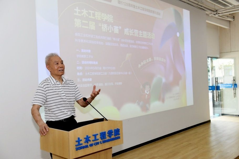 活动伊始,刘学信教授首先致辞。他表达了学校关工委对教职工子女的亲切问候和殷切期望。每一位少年儿童都是茁壮成长的青葱小苗,他们终将架设自己的桥梁连通未来。刘学信教授祝愿每一位桥小苗能在活动中激发出探索知识的乐趣,同时希望更多的人能够积极参与其中,让“桥小苗”学科知识成长营成为土木工程学院乃至学校的一道靓丽的风景线。