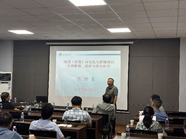 随后,张建经教授和张继春教授结合各自的研究经历,分别作了题为“包裹碎石桩复合地基静动性能研究”和“隧道(巷道)周边孔光面爆破的定向断裂、破碎与损伤研究”的学术报告。两位教授的报告集各自多年研究精华,内容丰富,学术价值高,引发全系师生对相关研究的深入思考,也被他们身上的科学精神打动。报告深入浅出、风趣轻松,为岩土系全体师生今后的学习和研究指明了方向。报告结束后,张迎宾教授、杨涛教授、教师代表魏星老师和袁冉老师为两位教授敬献鲜花并赠送纪念品,祝福他们福寿安康,笑颜永驻。张建经教授和张继春教授对系室组织本次活动表示感谢,他们回顾了多年以来与各位老师相处的点滴细节,感谢多年来大家对自己工作的支持、帮助和理解,希望青年教师和年轻学子将交大岩土精神薪火相传,为复兴交大岩土贡献力量。