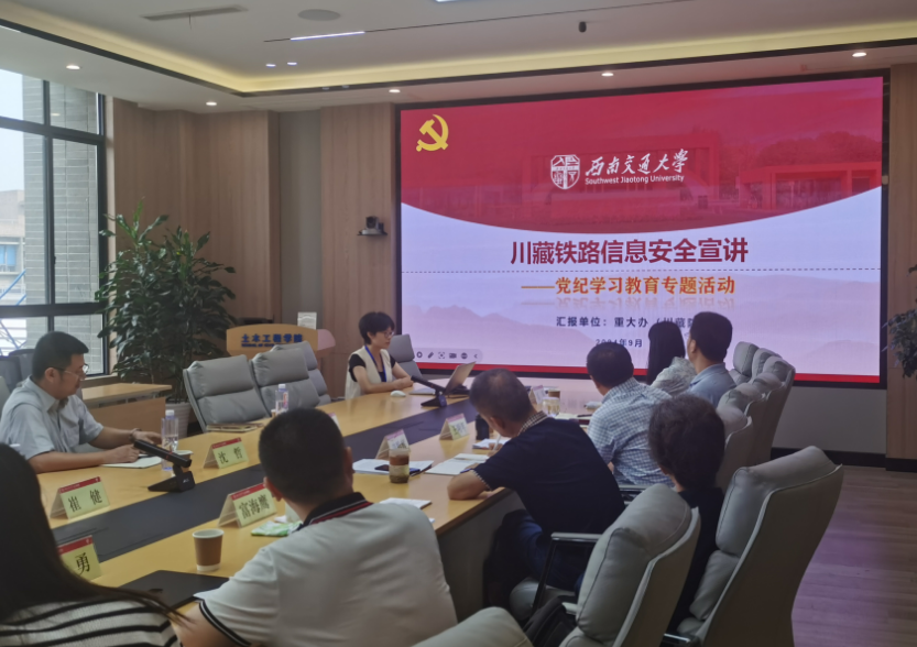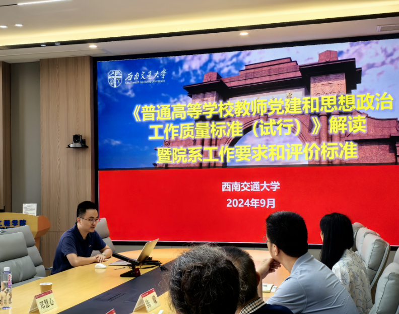 2024年9月19日上午10点,土木工程学院在犀浦校区4417A会议室召开党委和党政联席会议,学院领导班子成员、全体党委委员、科职干部以及部分教师代表参加了本次会议。会议邀请了学校机关与直属单位党委常务副书记沈哲、机关与直属单位党委综合管理办公室副主任奉天、党委教师工作部思政科科长崔健、重大工程办公室(川藏铁路研究院)项目主管邓慧心到会进行了“政策直通车”宣讲。本次宣讲的主要内容是师德师风建设专题和CZ铁路信息安全工作政策专题。