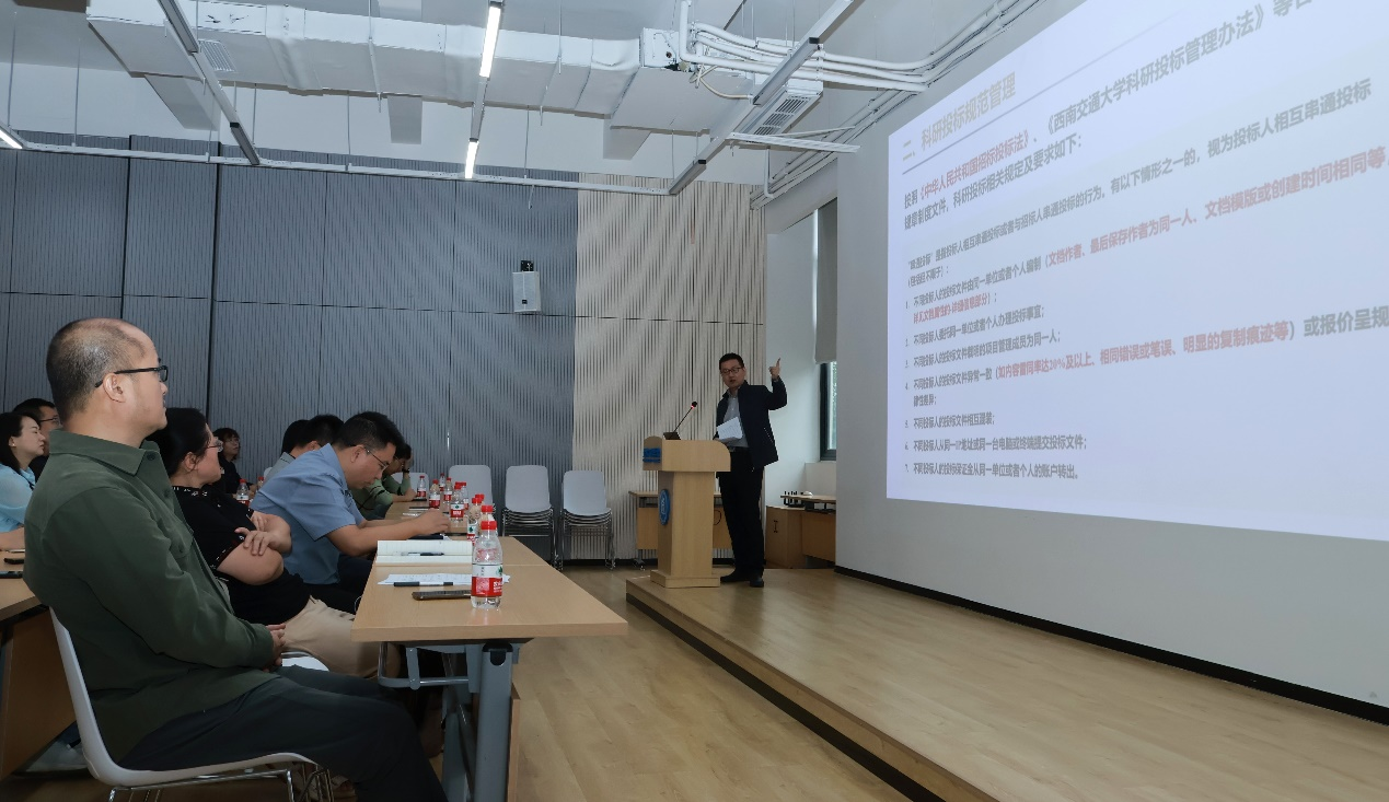 随后,学校科学技术发展研究院李怀龙副院长进行了《科研投标规范管理》专题宣讲。李院长首先提出加强科研诚信建设、科研经费管理和主动监管的重要性,强调广大教师一定要严格遵守国家和学校的规章制度,合理合法合规地开展科研活动,注重科研诚信。同时,详细介绍了科研投标规范管理,指出现阶段科研投标信息化建设正逐步完善,学校教学科研人员应强化责任意识,严格遵守各项规定,规范投标行为。