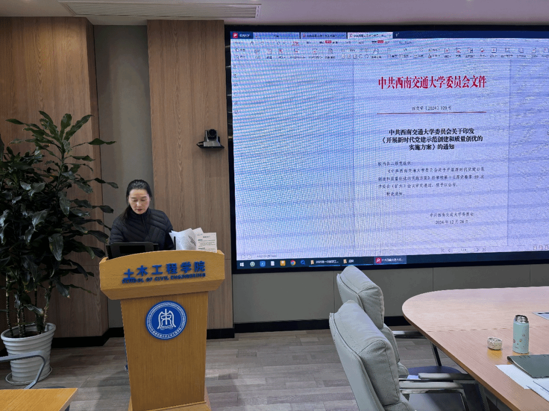 首先甘泉主任带领大家学习习近平总书记关于奋斗的语录;随后依次由熊麟老师在会上布置了基层党支部2024年度组织生活会的相关事宜;车小洁副书记带领学习《开展新时代党建示范创建和质量创优的实施方案》并布置申报工作;王楠老师带领学习《开展基层党组织“1+ 1”合作共建行动的实施方案》并布置申报工作。郑江书记带领学习了《土木工程院长2024年度工作报告》。车小洁副书记和刘萍副书记通报近期工作情况。郑江书记听取与会人员对《土木工程学院教职工党支部书记工作例会实施办法(征求意见稿)》的意见建议。王艺霖主席做了党建带工建背景下学院工会近期工作通报与动员。