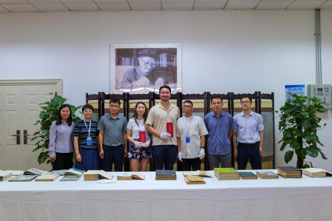 在图书馆,夫妇受到热情接待。在图书馆馆长和大使的引导下,他们重点参观了馆内珍藏的林同炎先生求学时期的宝贵史料。在古籍特藏区,他们见到了林同炎先生当年在唐山交大求学时的毕业设计手稿原件,泛黄的纸张、工整的字迹,无声诉说着青年林同炎严谨治学的态度和在工程领域展现的非凡天赋。这些珍贵档案是我校“严谨治学、严格要求”双严传统的生动写照,也让夫妇二人得以近距离触摸祖父的青春岁月与学术起点。