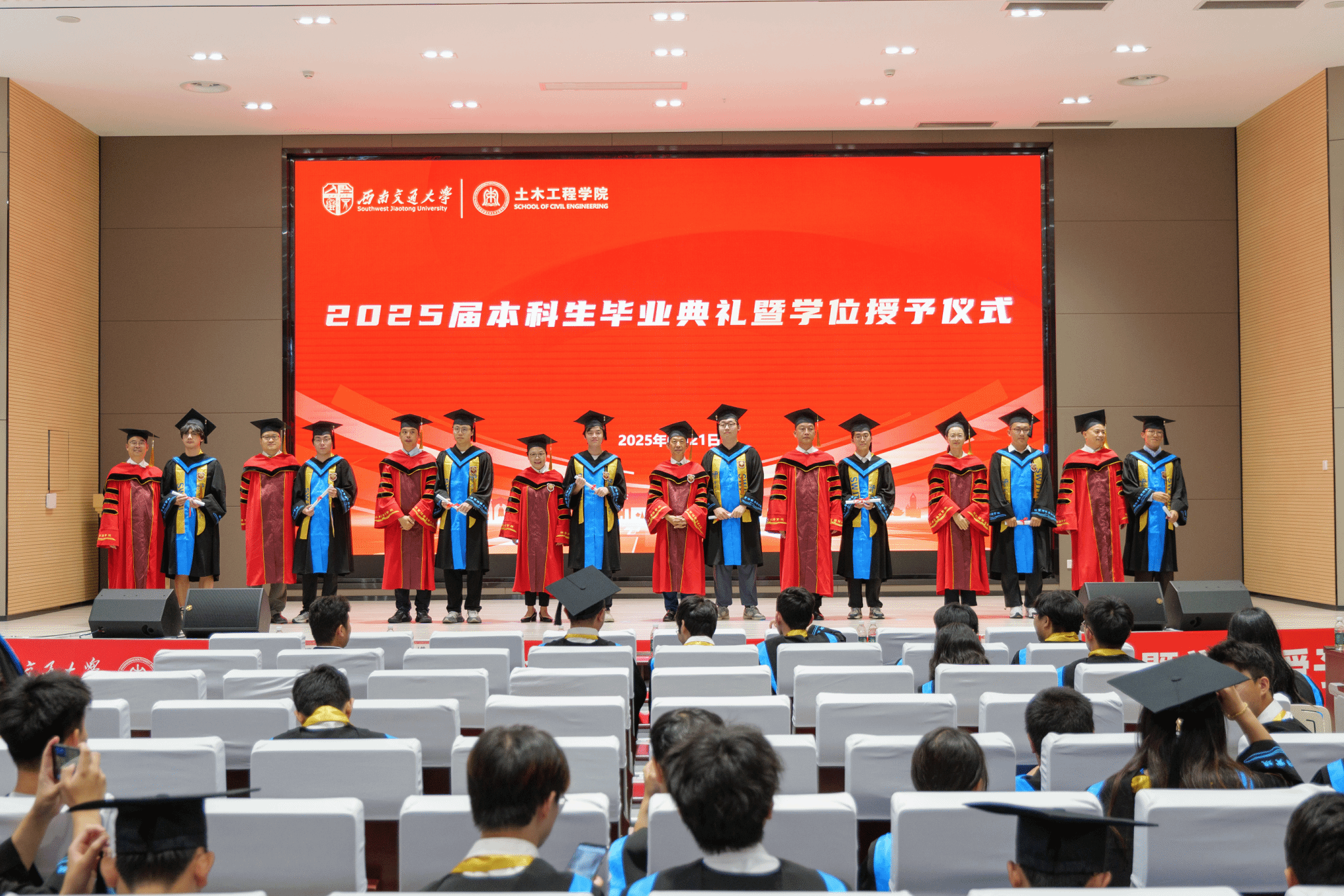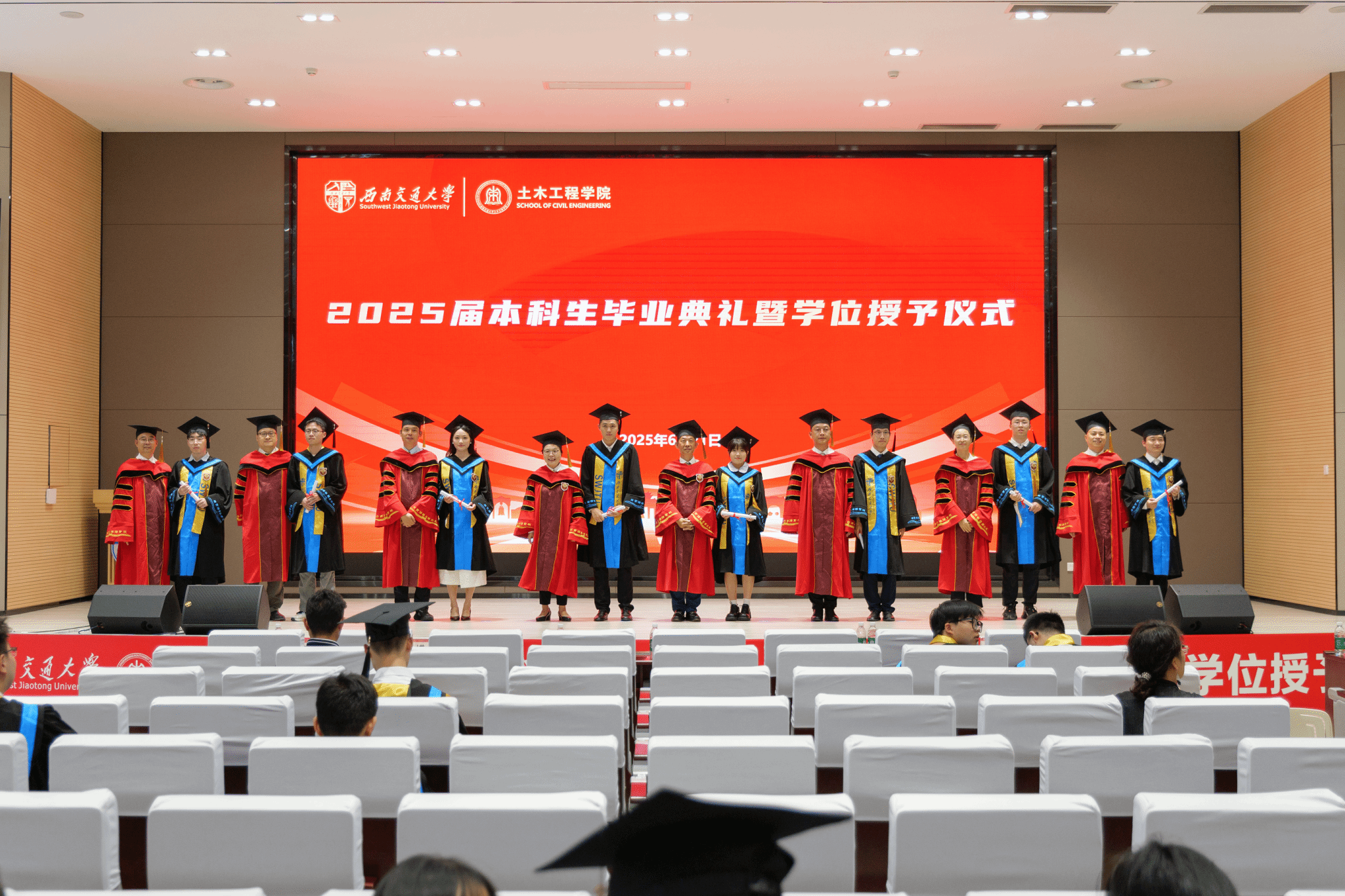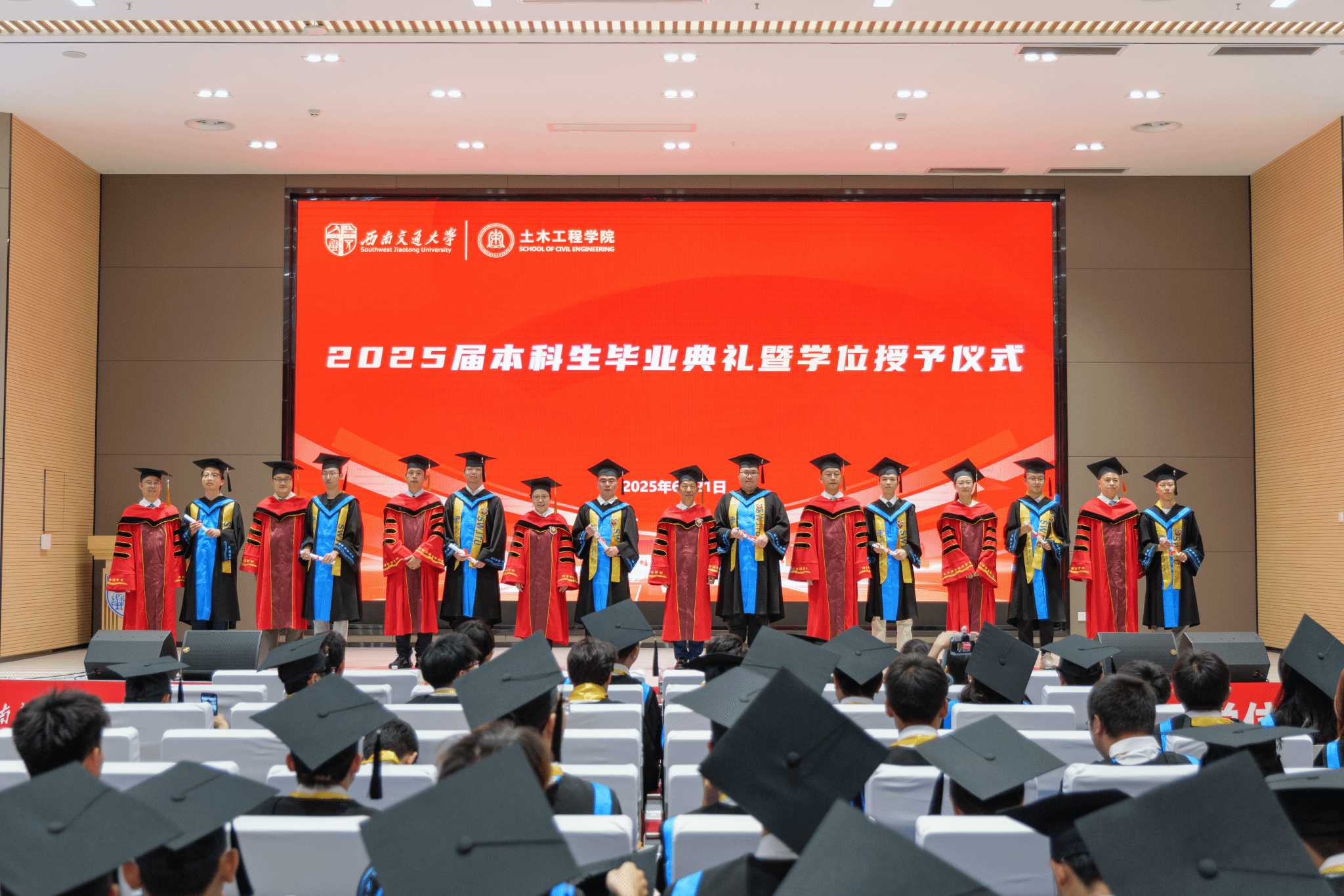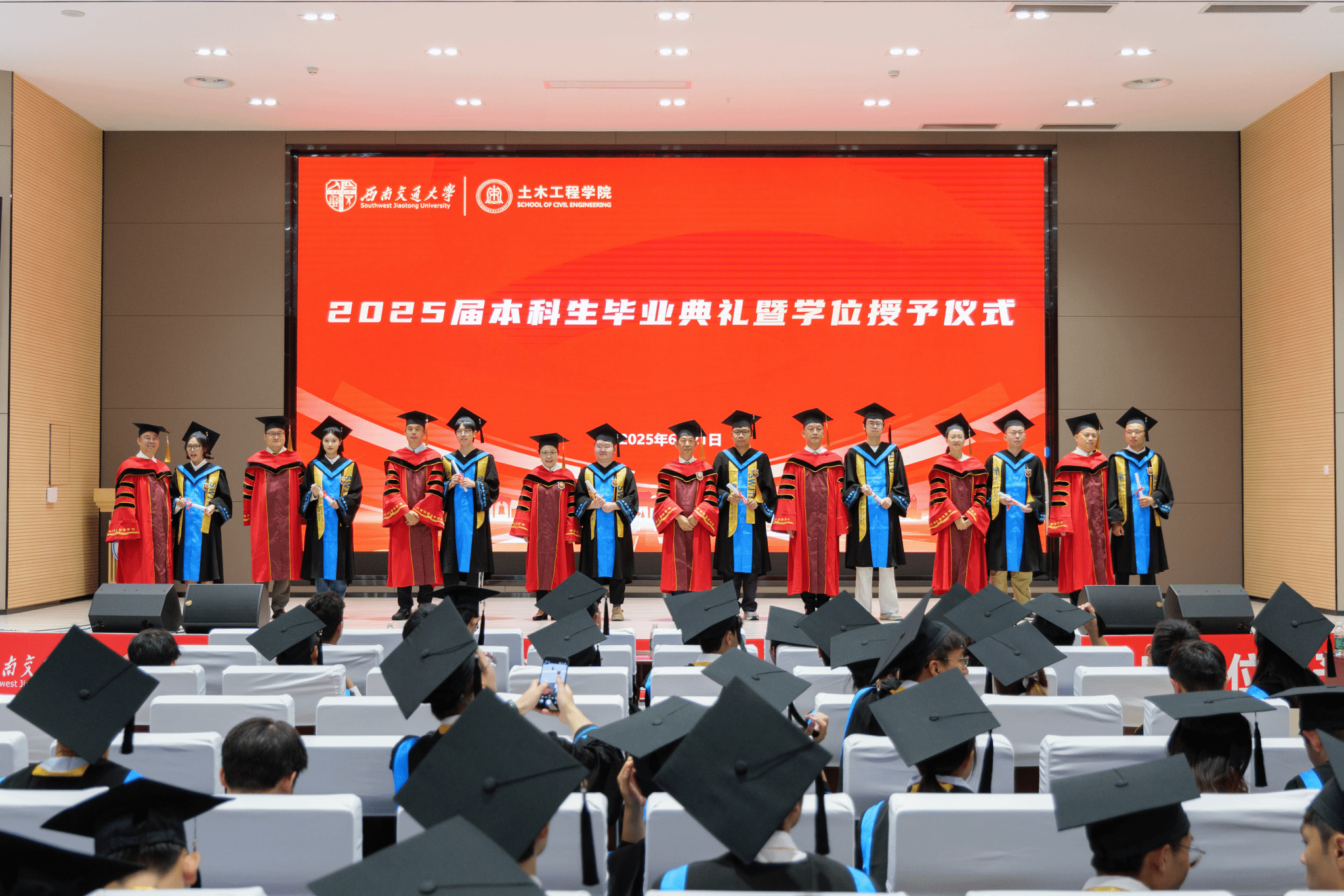 六月盛夏,骊歌奏响。6月21日下午,土木工程学院2025届本科生毕业典礼暨学位授予仪式在犀浦校区“双一流”会议中心顺利召开。土木工程学院院长蒲黔辉、党委书记郑江、副院长陈嵘、党委副书记兼副院长车小洁、副院长徐腾飞、副院长于丽、道路与铁道工程系主任杨荣山、地下工程系主任方勇、岩土工程系主任杨涛、陆地交通灾害防治技术研究中心执行主任庄卫林、建筑工程系副主任刘艳辉、结构力学教研室主任蔡婧、图学及BIM研究所副主任赵莉香、21级班导师代表王志杰、金虎、教师代表徐井芒、学院综合事务办公室主任黄雪娇、学工组副组长张进出席毕业典礼,全体辅导员及毕业生家长共同见证这一意义非凡的时刻。典礼由学院党委副书记刘萍主持。