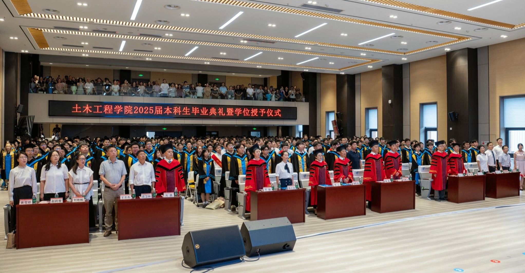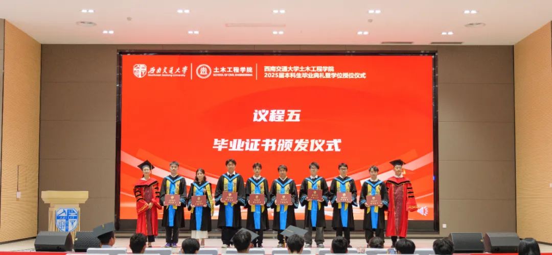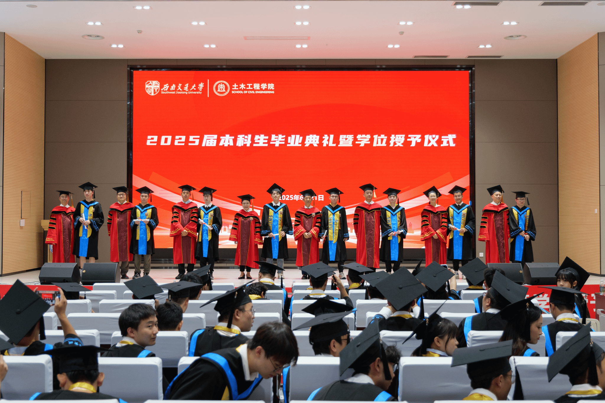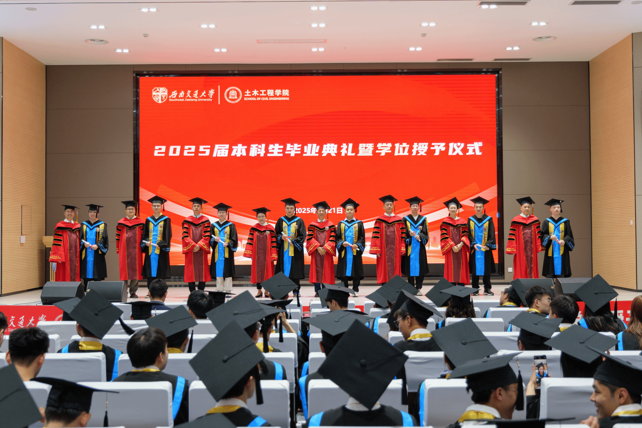 六月盛夏,骊歌奏响。6月21日下午,土木工程学院2025届本科生毕业典礼暨学位授予仪式在犀浦校区“双一流”会议中心顺利召开。土木工程学院院长蒲黔辉、党委书记郑江、副院长陈嵘、党委副书记兼副院长车小洁、副院长徐腾飞、副院长于丽、道路与铁道工程系主任杨荣山、地下工程系主任方勇、岩土工程系主任杨涛、陆地交通灾害防治技术研究中心执行主任庄卫林、建筑工程系副主任刘艳辉、结构力学教研室主任蔡婧、图学及BIM研究所副主任赵莉香、21级班导师代表王志杰、金虎、教师代表徐井芒、学院综合事务办公室主任黄雪娇、学工组副组长张进出席毕业典礼,全体辅导员及毕业生家长共同见证这一意义非凡的时刻。典礼由学院党委副书记刘萍主持。