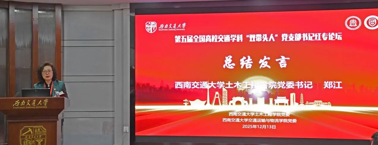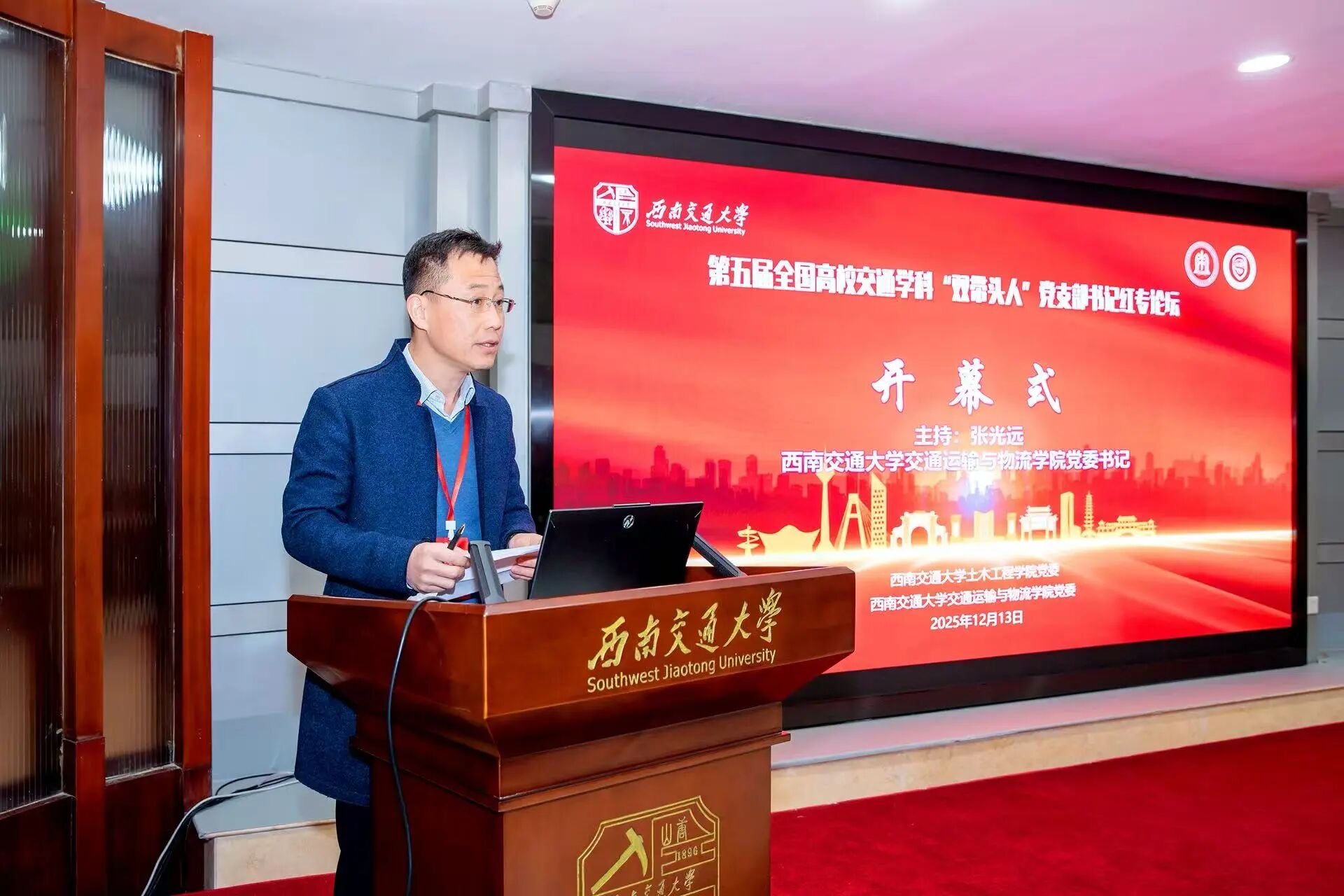 12月13日,第五届全国高校交通学科“双带头人”党支部书记红专论坛在西南交通大学成功召开。此次论坛以“蓉城聚智践初心,交通铸脉兴西部——党建引领学科融合赋能区域高质量发展”为主题,来自哈尔滨工业大学、同济大学、东南大学、华南理工大学、中山大学、上海交通大学、长安大学、北京交通大学、苏州大学、合肥工业大学、西安建筑科技大学、上海海事大学等全国高校交通学科“双带头人”教师党支部书记、党建工作者以及我校土木工程学院和交通运输与物流学院教师党支部书记、土木道路与铁道工程系教工党支部代表等60余人参加了此次论坛。本次论坛由bat365中文官方网站党委和交通运输与物流学院党委联合主办。