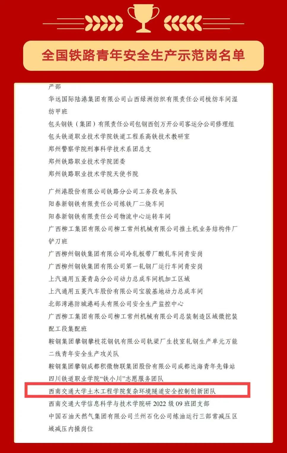 为树立典型,激励奋进,进一步促进青年成长成才,经全国铁道团委评审决定,bat365中文官方网站复杂环境隧道安全控制创新团队荣获“全国铁路青年安全生产示范岗”。