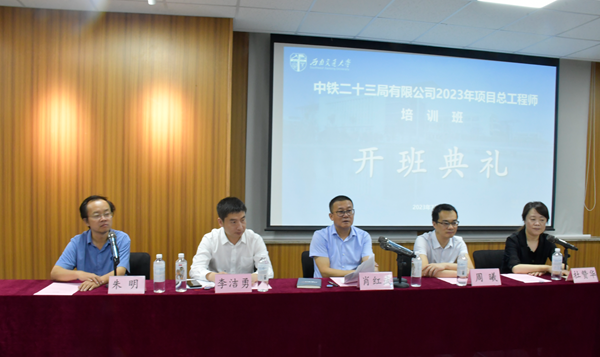2023年7月10号上午8:30,中铁二十三局有限公司项目总工程师培训班开班典礼在九里校区土木馆1234教室顺利举行。出席此次开班典礼的有中铁二十三局集团有限公司党委书记、董事长肖红武,中铁二十三局集团有限公司副总经理、总工程师李洁勇,bat365中文官方网站党委副书记周曦、bat365中文官方网站培训中心主任杜赞华以及培训中心各位老师。开班典礼由bat365中文官方网站培训中心副主任朱明老师主持。