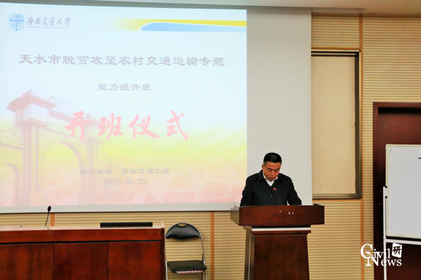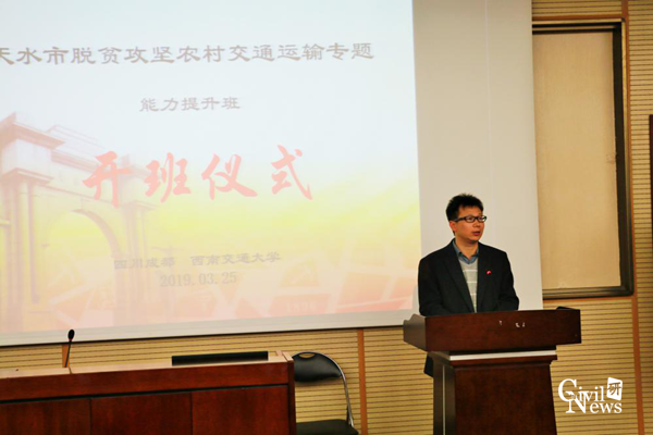 甘肃省天水市交通运输局党组副书记王炤俊讲话。首先,王书记介绍了天水市交通运输设施建设现状并对承办此次培训的西南交通大学表示了感谢。王书记对全体学员提出要求,希望全体学员能珍惜学习机会,沉下心来学,积极主动学,带着问题学,最终学有所获。最后希望各位学员在培训期间严格遵守纪律,互相帮助,保证培训班学习顺利完成。